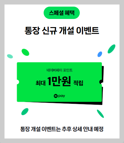 • 신규로 통장 개설하시면 네이버페이 포인트를 최대1만원 적립 혜택(추후 상세 안내 예정)