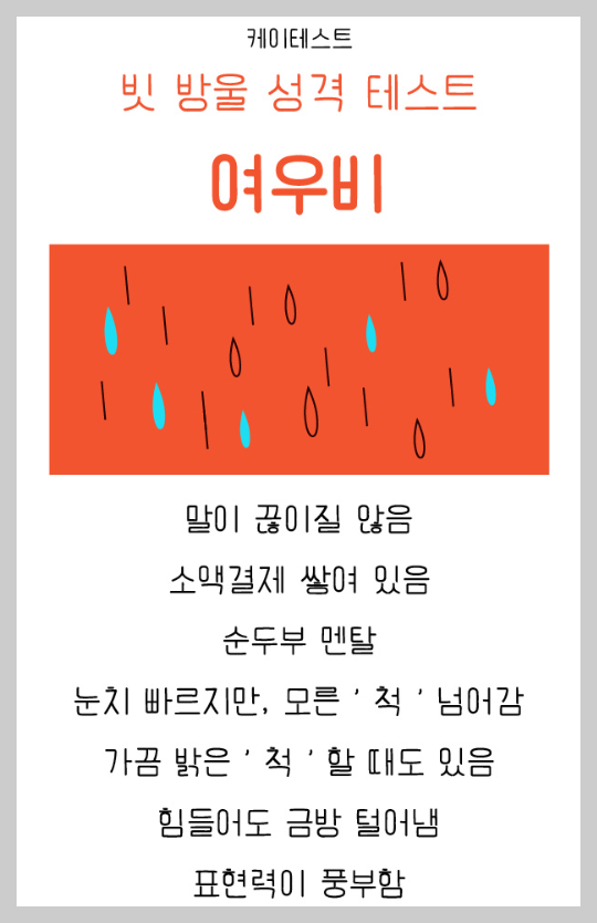 매일 비 오는 장마철에 밖에 약속 잡기도 힘들고 이런 날에는 시원한 집에서 맛있는 걸 먹으면서 조용히 자신을 돌아보는 시간을 가지는 것은 어때요? 케이 테스트라는 곳에서 여러버 전으로 성격테스트를 할 수 있는데 상당히 비슷하게 나와서 재미있어요.