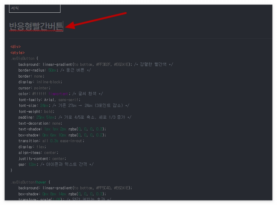 | <div> <style> .myBigButton { background: linear-gradient(to bottom, #FF3B2F, #E62A1E); /* 강렬한 빨간색 */ border-radius: 50px; /* 둥근 버튼 */ border: none; display: inline-block; cursor: pointer; color: #ffffff !important; /* 글씨 흰색 */ font-family: Arial, sans-serif; font-size: 24px; /* 기존 27px → 24px (3포인트 감소) */ font-weight: bold; padding: 25px 51px; /* 가로 4/5로 축소, 세로 1/3 증가 */ text-decoration: none; text-shadow: 1px 1px 2px rgba(0, 0, 0, 0.3); box-shadow: 0px 6px 10px rgba(0, 0, 0, 0.2); transition: all 0.3s ease-in-out; display: flex; align-items: center; justify-content: center; gap: 12px; /* 아이콘과 텍스트 간격 */ } .myBigButton:hover { background: linear-gradient(to bottom, #FF5C4D, #E62A1E); box-shadow: 0px 8px 14px rgba(0, 0, 0, 0.3); transform: scale(1.05); /* 약간 커지는 효과 */ } .myBigButton:active { transform: scale(0.98); /* 클릭 시 약간 눌리는 효과 */ } </style> </div> <div style="text-align: center;"><a class="myBigButton" href="https://www.example.com"> <b>문구를 입력하세요</b> 👆 </a></div> |