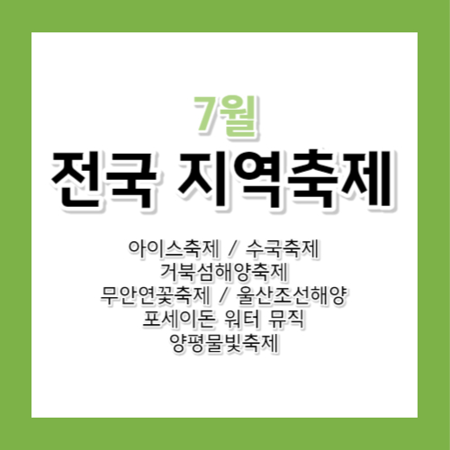 7월에 전국의 축제일정을 한 눈에 보시고 결정하세요! 거창한 휴가가 아니라도 아이들과 함께하는 시간은 행복이고 추억이잖아요? 아래에서 확인하시고 가까운 곳은 방문해 보세요.