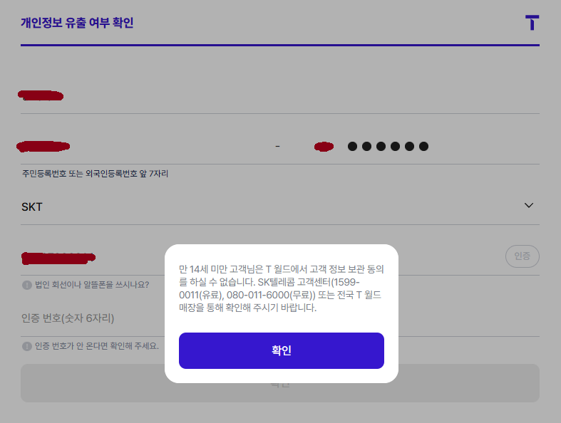 단, 자녀들인 경우 만14세 미만은 온라인 유출조회서비스를 이용하실 수 없고 SK텔레콤 고객센터(1599-0011, 080-011-6000) 또는 전국 T월드 매장을 통해서 확인하셔야 합니다.